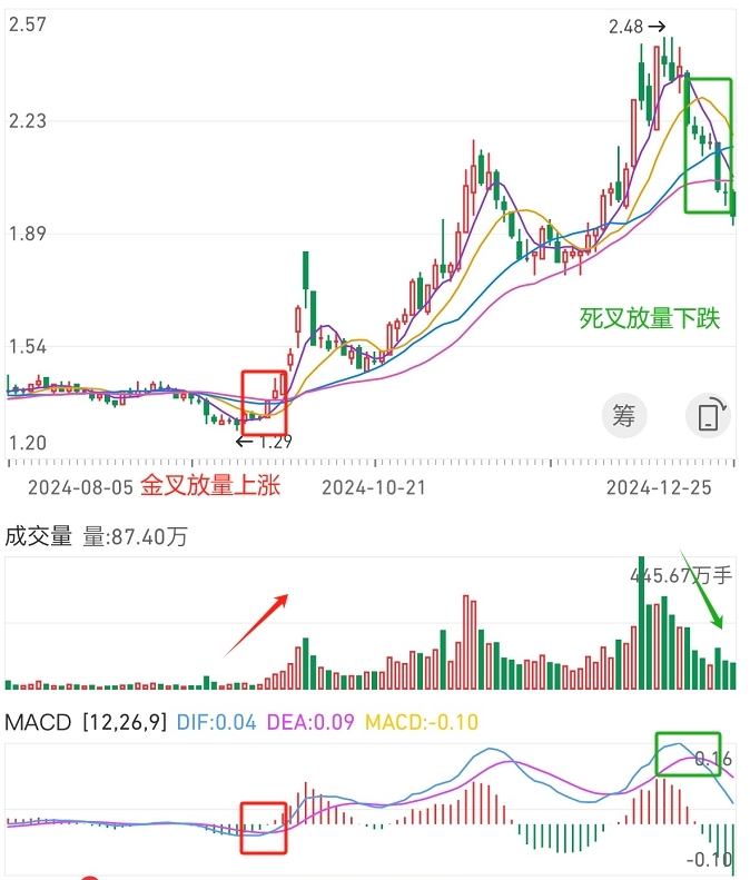 反之,MACD 死叉且成交量萎缩,股价下跌概率高; 当然因为时间问题,MACD就不细讲了,大家可以网上找一下课程自己学习。